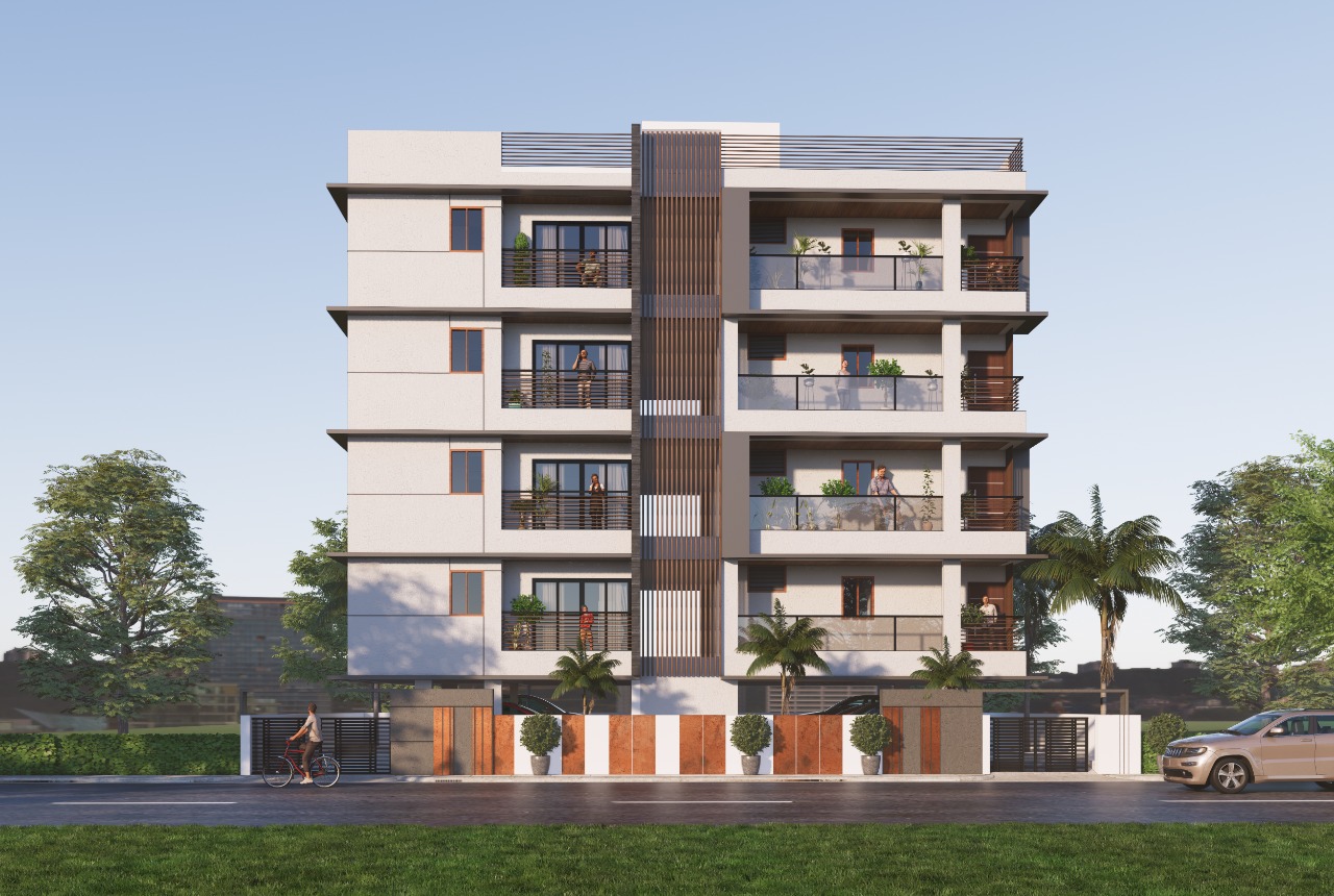 A modern residential apartment complex with communal green spaces and rooftop gardens.
